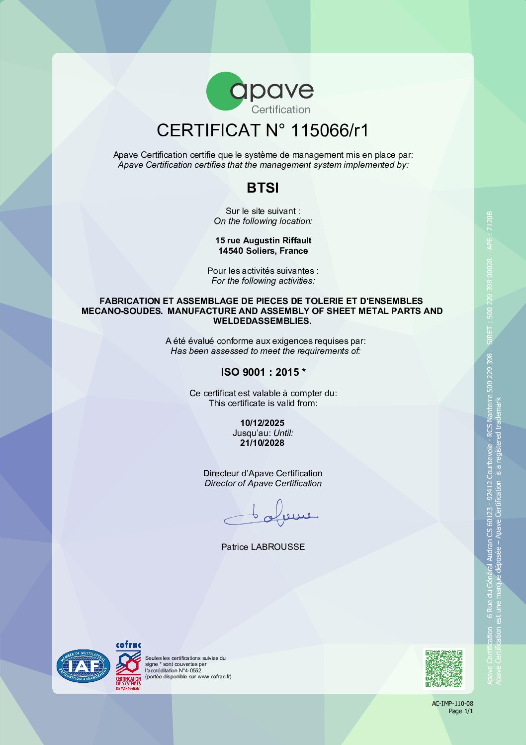 BTSI, spécialiste de la tôlerie fine industrielle sur-mesure, est fière d’annoncer le renouvellement de sa certification ISO 9001:2015, délivrée par l’APAVE. Cette reconnaissance, obtenue après un audit rigoureux, confirme notre engagement quotidien en faveur de l’excellence opérationnelle et de la satisfaction client.